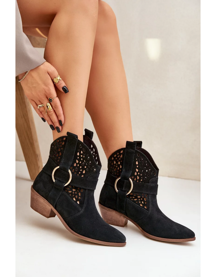 Stylowe i eleganckie botki damskie wykonane z naturalnego zamszu, które doskonale łączą modny wygląd z wygodą użytkowania. Model osadzony na niskim obcasie, idealny na co dzień i do bardziej formalnych stylizacji. Ażurowa cholewka ozdobiona delikatnym akcentem nadaje im wyjątkowego charakteru. Szpiczaste noski optycznie wysmuklają stopę, dodając szyku każdemu zestawowi. To doskonały wybór dla kobiet ceniących jakość, styl i komfort. Przy wyborze rozmiaru prosimy sugerować się tabelą rozmiarów.